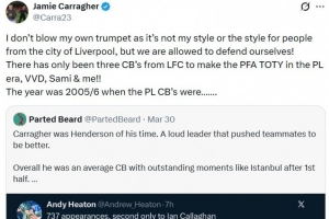 事情首先是球迷Yazz LFC评价卡拉格:“为啥这么多利物浦球迷都忘了,杰米・卡拉格只是个平庸的中卫……我还记得看他追着别人影子跑,还打进乌龙球。当评论员他更烂。”