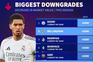 1-罗德里(曼城),下降4500万欧,当前身价6500万欧